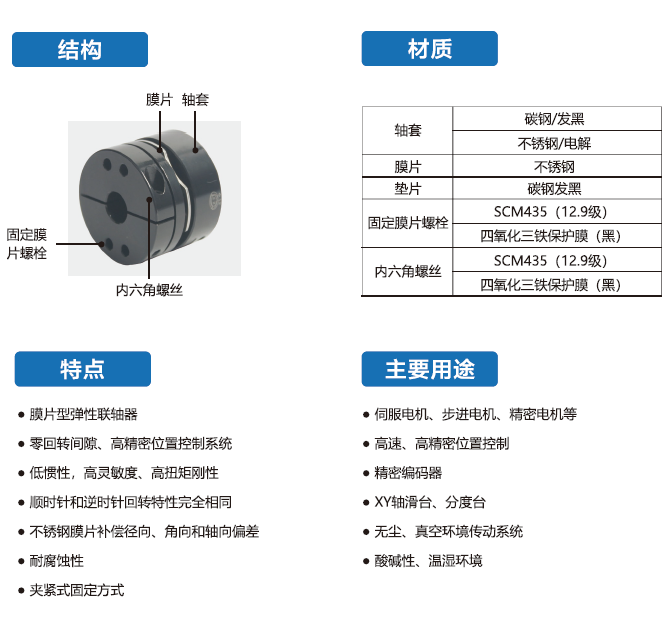 DFPS-C系列聯軸器采用碳鋼發黑,利用脹緊套聯接的膜片型彈性聯軸器,廣泛用于伺服電機、步進電機、精密電機等。
