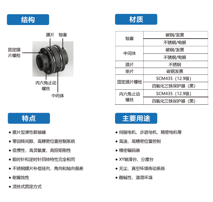 HSJP-G系列聯(lián)軸器采用碳鋼發(fā)黑,利用脹緊套聯(lián)接的膜片型彈性聯(lián)軸器,廣泛用于伺服電機、步進電機、精密電機等。