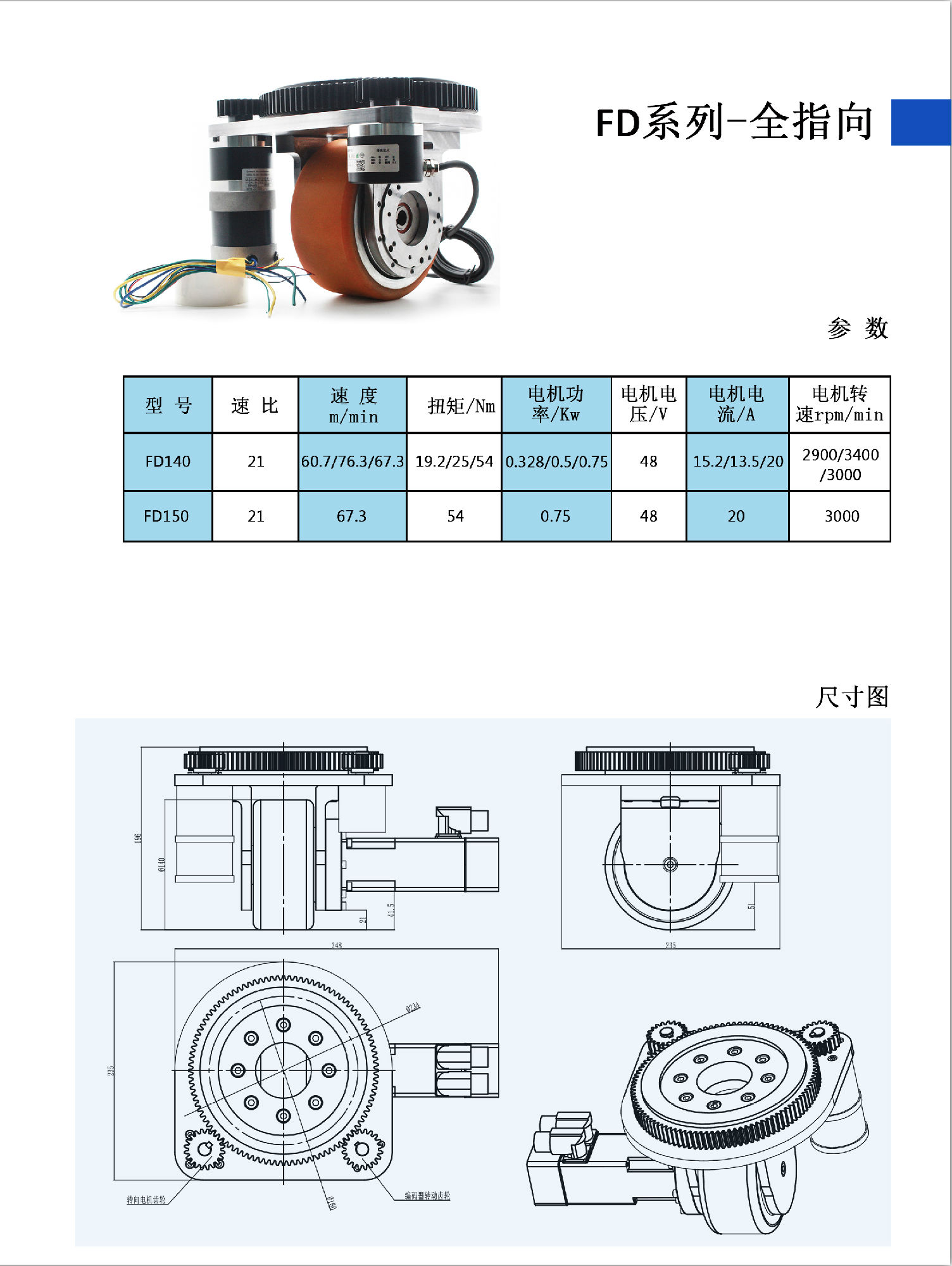 FD系列舵輪組,全指向型。采用差速驅(qū)動(dòng)輪組模塊,將減速機(jī)與驅(qū)動(dòng)輪設(shè)計(jì)為一體,加外接直流電機(jī),成為高度集成的機(jī)電一體化AGV行走驅(qū)動(dòng)輪組組件。其結(jié)構(gòu)簡單,性能可靠,便于安裝。