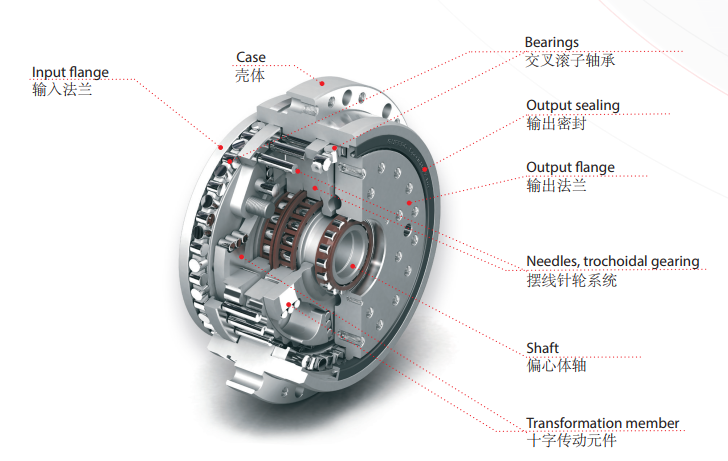 輸入和輸出法蘭通過配合螺栓固定在一起,并在徑向軸向輸出中減速旋轉軸承相對于殼體。