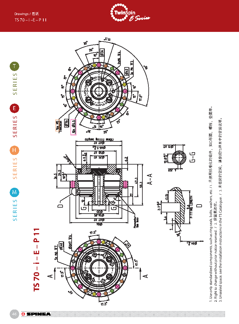 E 系列是帶有法蘭形殼體的Twinspin高精度減速機。 該系列內部包含精密減速機構和高強度交叉滾子軸承,又 名“軸承式減速機”。這種設計可以把負載直接安裝在減 速機輸出法蘭上,省去輸出端的額外軸承。 T系列采用模塊化設計,允許用戶通過電機法蘭的方式連 接各種電機。 標準的T系列減速機為半密封狀態;需要用輸入法蘭和墊 圈密封。SPINEA可根據客戶電機結構提供全密封帶輸入 法蘭的減速機。