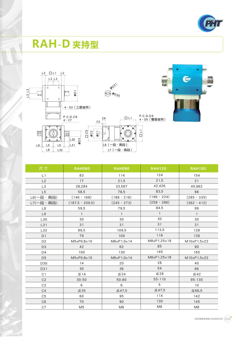 RAH-D系列是夾持型設計。 鋁合金材質可提高散熱能力,減緩溫升現象造成影響。 多樣化的出力軸可因應各種場合,客制化的入力端可搭配各式馬達。 提供各式特色之減速機,供使用者依需求選購。 特殊油封設計,正常使用下不需保養亦不用更換潤滑油,可延長使用壽命。 各式特色,體積小,省空間,噪音低,輸出扭矩高,安裝容易,可搭配馬達型號廣泛。 RAH搭配DM,一體成型的齒輪組,可有效的減低噪音。 RAH搭配DH,最佳的性價比,可廣泛應用于各種場合。