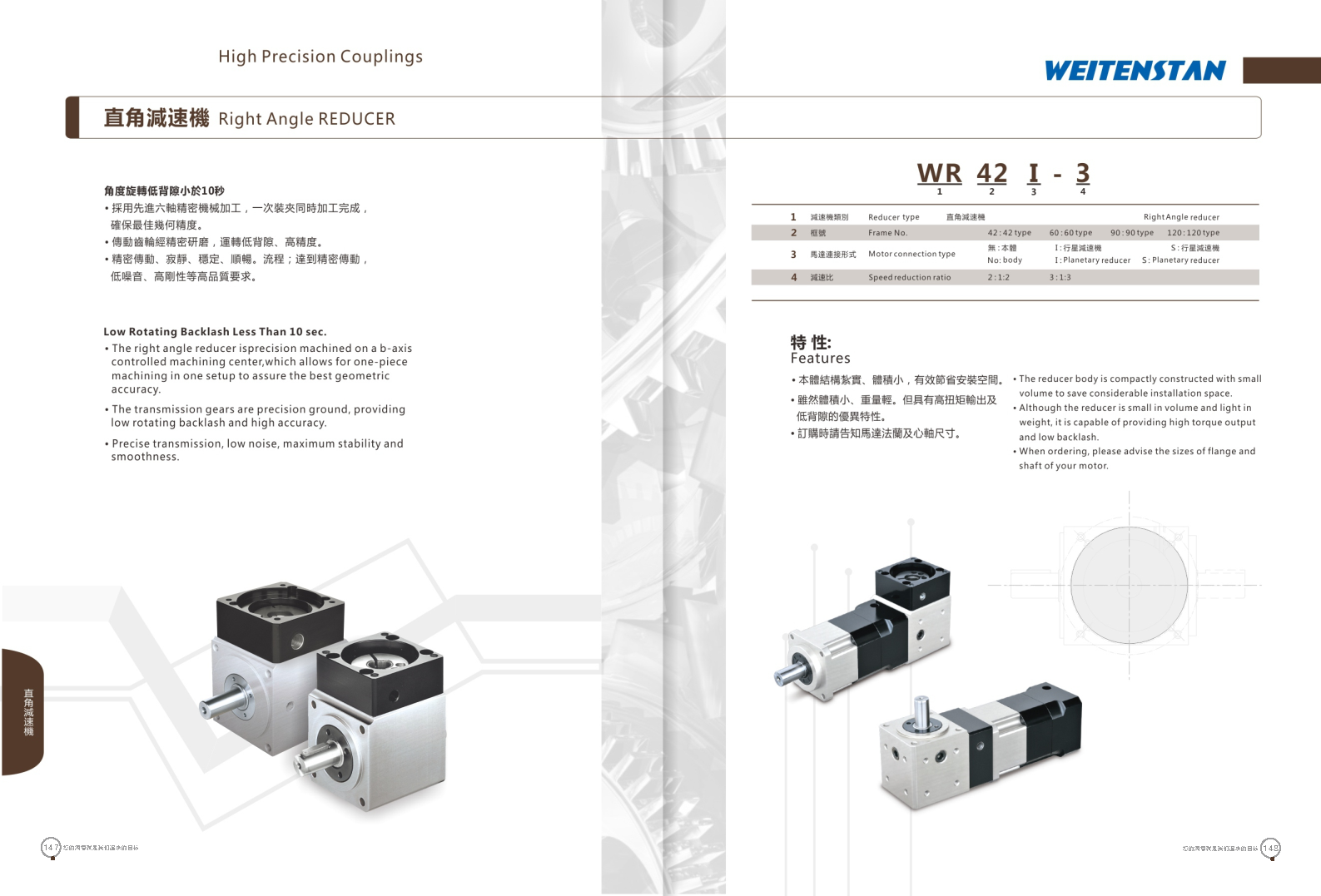 WR系列直角減速機(jī)。 角度旋轉(zhuǎn)低背隙小于10秒。 采用先進(jìn)六軸精密機(jī)械加工,一次裝夾同時(shí)加工完成,確保最佳幾何精度。 傳動(dòng)齒輪經(jīng)緊密研磨,運(yùn)轉(zhuǎn)低背隙、高精度。 精密傳動(dòng)、寂靜、穩(wěn)定、順暢。流程:達(dá)到精密傳動(dòng),低噪音,高剛性等高品質(zhì)要求。 本體結(jié)構(gòu)扎實(shí),體積小,有效節(jié)省安裝空間。 雖然體積小,重量輕,但具有高扭矩輸出及低背隙的優(yōu)異特性。